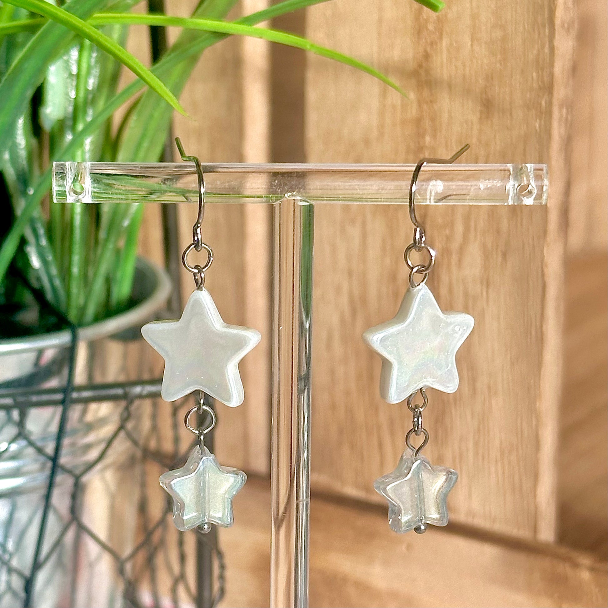 Made with stainless steel hooks, star shaped imitation pearl and glass beads. Hypoallergenic.