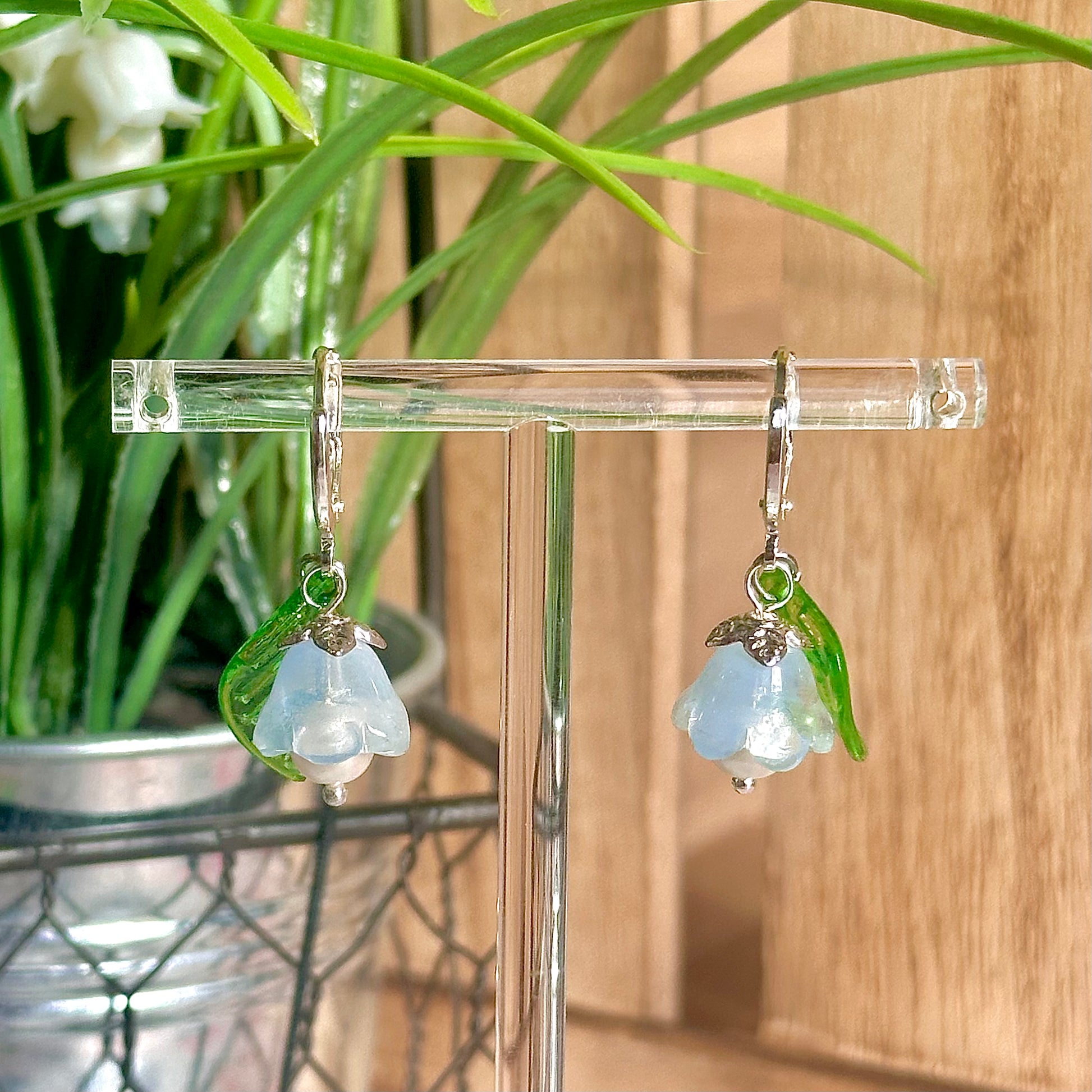Floral earrings made with silver plated brass hoops, silver plated findings, glass beads, and imitation pearls.